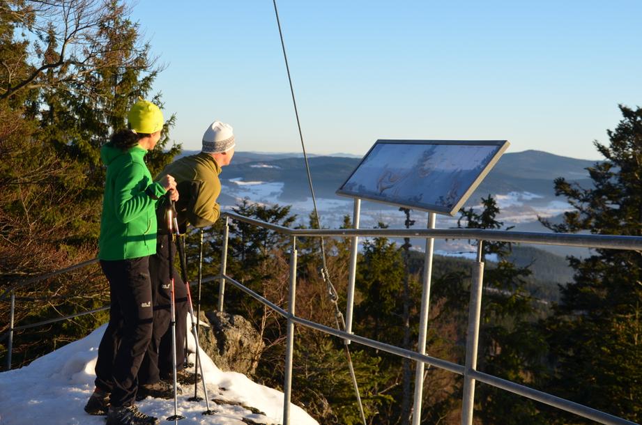 Vom Ausgangspunkt folgt man dem Winterwanderweg Nr. 1 (gelb) bis man die Abzweigung links Richtung Schachtenbach erreicht. Von hier geht es weiter auf dem Wanderweg Nr. 29 (rot). Auf Waldwegen am „Dachsriegel“ und dem markanten „Emailriegel“ vorbei, trifft man auf eine Forststraße, die nach Schachtenbach führt. Von der Brücke über den Schachtenbach verläuft der Weg auf schnurgerader Strecke hinauf zur „Roten Höhe“. Auf dem Scheitelpunkt überquert man dort eine Forststraße und gelangt dann, bergab - nach einer weiteren querenden Forststraße - bei einem mächtigen Bergahorn auf die „Kiesstraße“, wo man nach links abbiegt und zum „Historischen Quarzbruch“ im Naturschutzgebiet Kiesau kommt. Entlang des „Gläsernen Kreuzweg“ gelangt man dann auf den Hennenkobel, den Rabensteiner Hausberg mit einer grandiosen Aussicht auf den Zwieseler Winkel und bei klarer Sicht bis in die Alpen. Weiter geht es auf dem Wanderweg Nr. 29 um die Felsen hinunter Richtung Rabenstein, wo wir auf den Wanderweg Nr. 28 (rot) stoßen, in den wir links einbiegen, um über den Kneippweg zurück zum Ausgangspunkt zu gelangen.